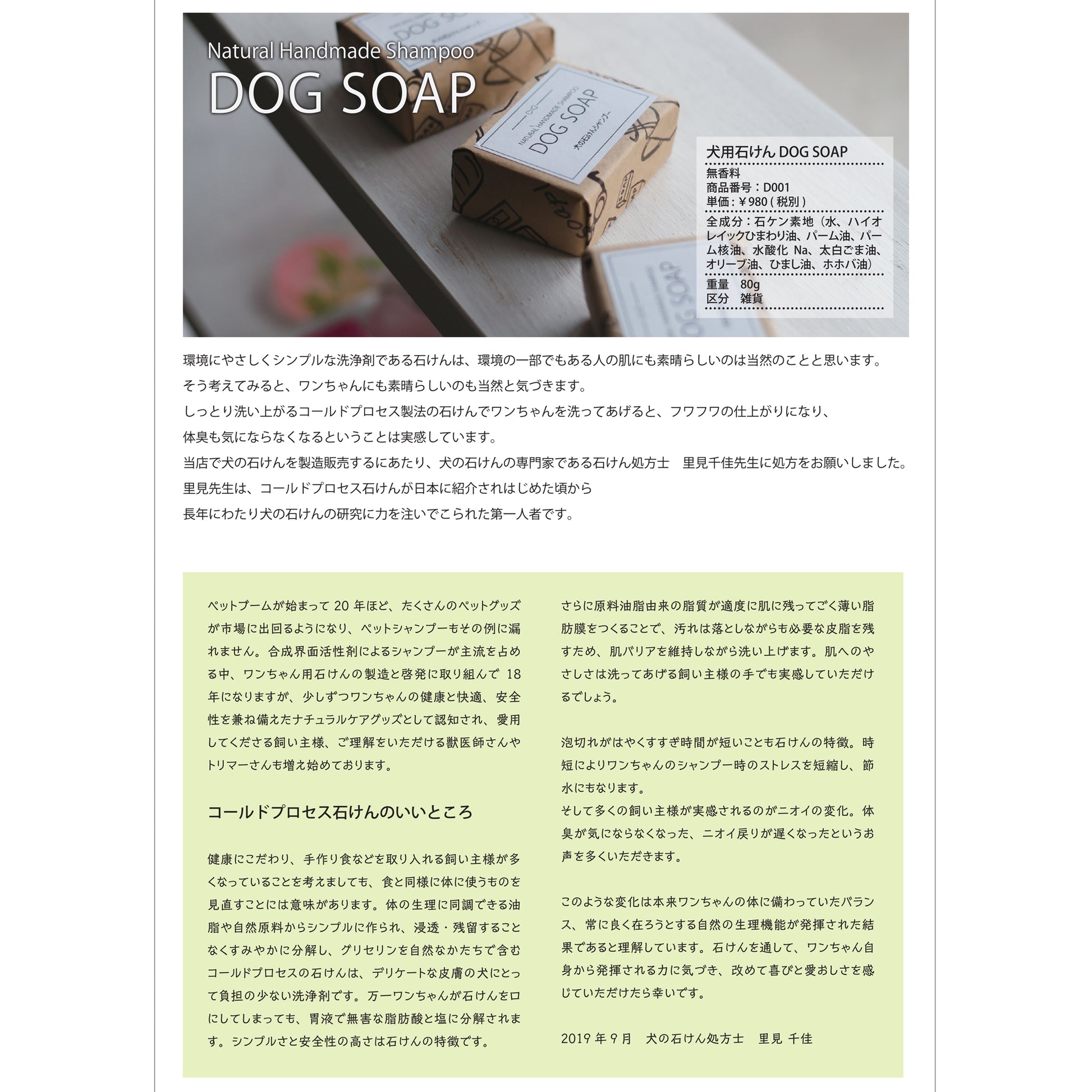 当店で犬の石けんを製造販売するにあたり、犬の石けんの専門家である石けん処方士 里見千佳先生に処方をお願いしました。里見先生は、コールドプロセス石けんが日本に紹介されはじめた頃から長年にわたり犬の石けんの研究に力を注いでこられた第一人者です。