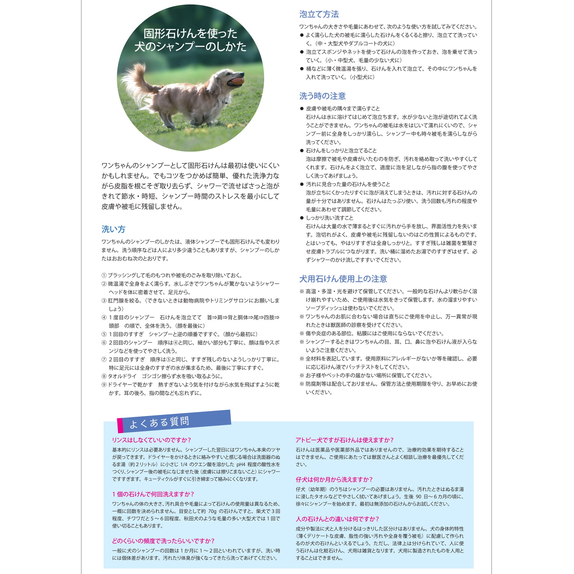 ワンちゃんのシャンプーとして固形石けんは最初は使いにくいかもしれません。でもコツをつかめば簡単、優れた洗浄力ながら皮脂を根こそぎ取り去らず、シャワーで流せばさっと泡がきれて節水・時短、シャンプー時間のストレスを最小にして皮膚や被毛に残留しません。