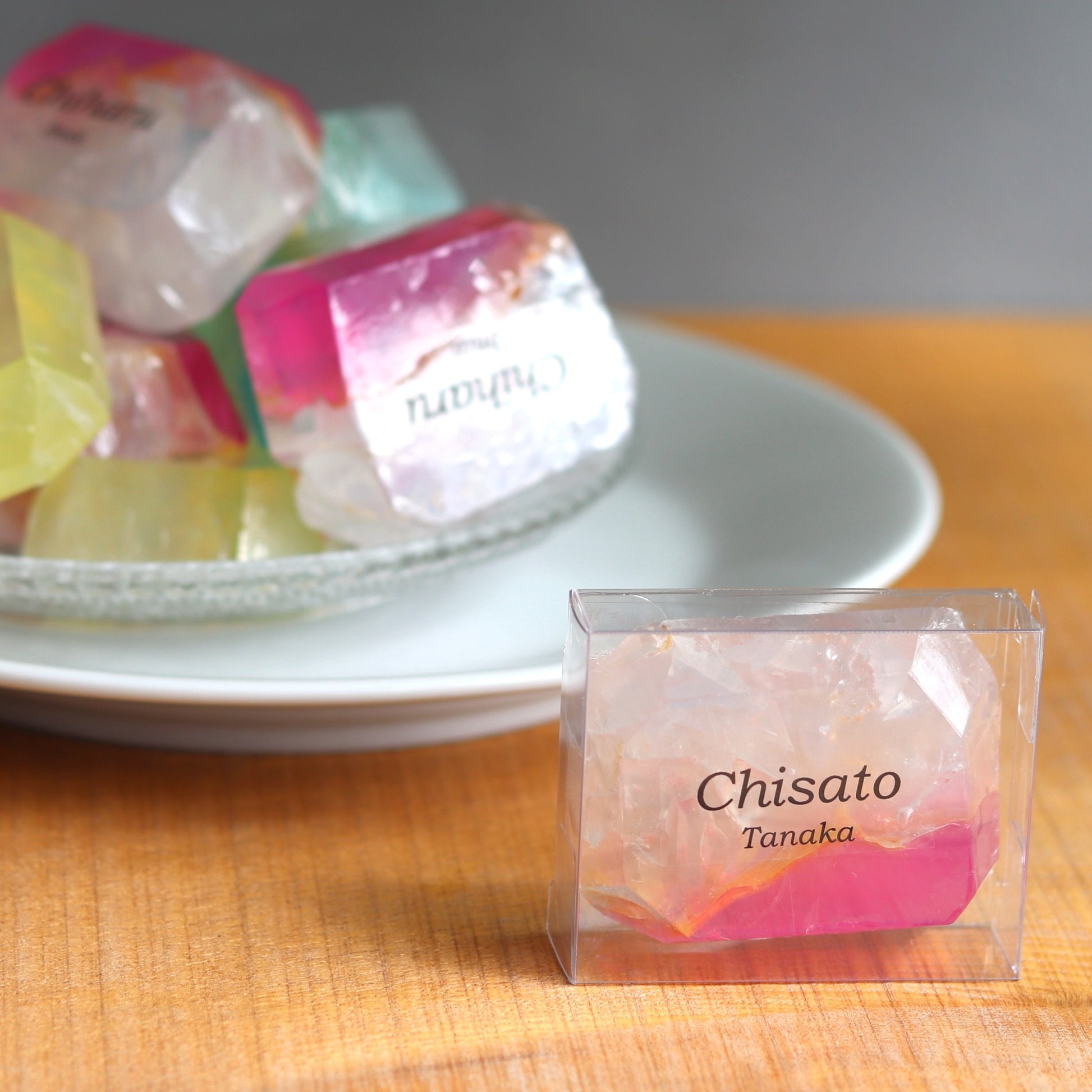 宝石のようにきらめく「宝石石鹸プレート」は、席札やプチギフトに最適です。名前入れ・メッセージ入れ・挙式日の印字に対応し、10個〜の小ロットからご注文いただけます。