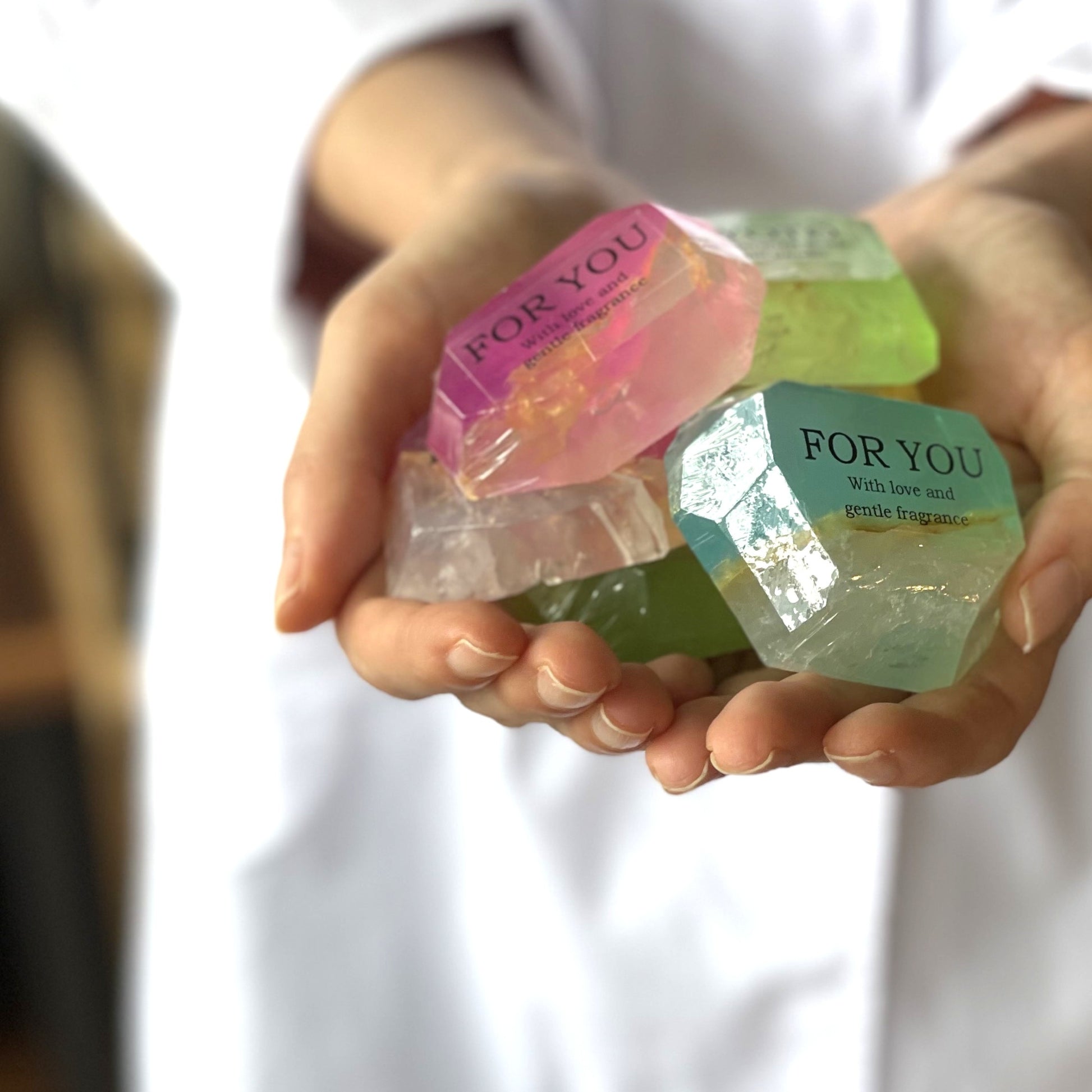 見た目も香りも華やかな宝石石鹸。美しい石鹸の表面に文字が入って、特別感を演出します。手洗いや洗顔にお使いいただける化粧石鹸で、ご使用時には天然の香りで癒されます。大切な人に贈る、特別なギフトとして是非ご利用ください。