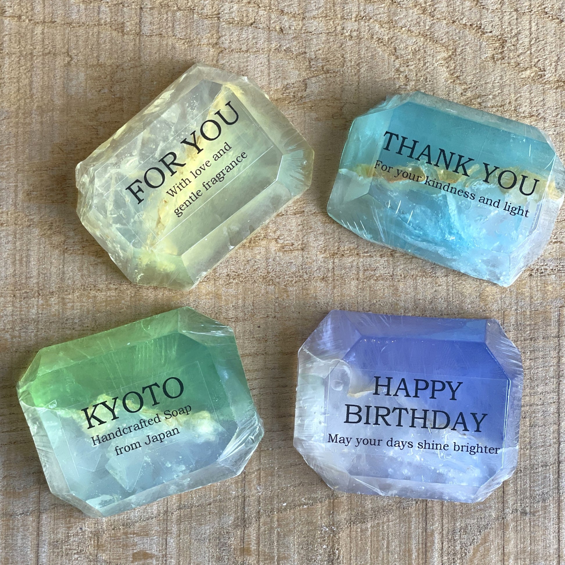 定番メッセージ(Thank You、Happy Birthday、For You、KYOTO)入りの宝石石鹸プレートは1個からお買い求めいただけます。
