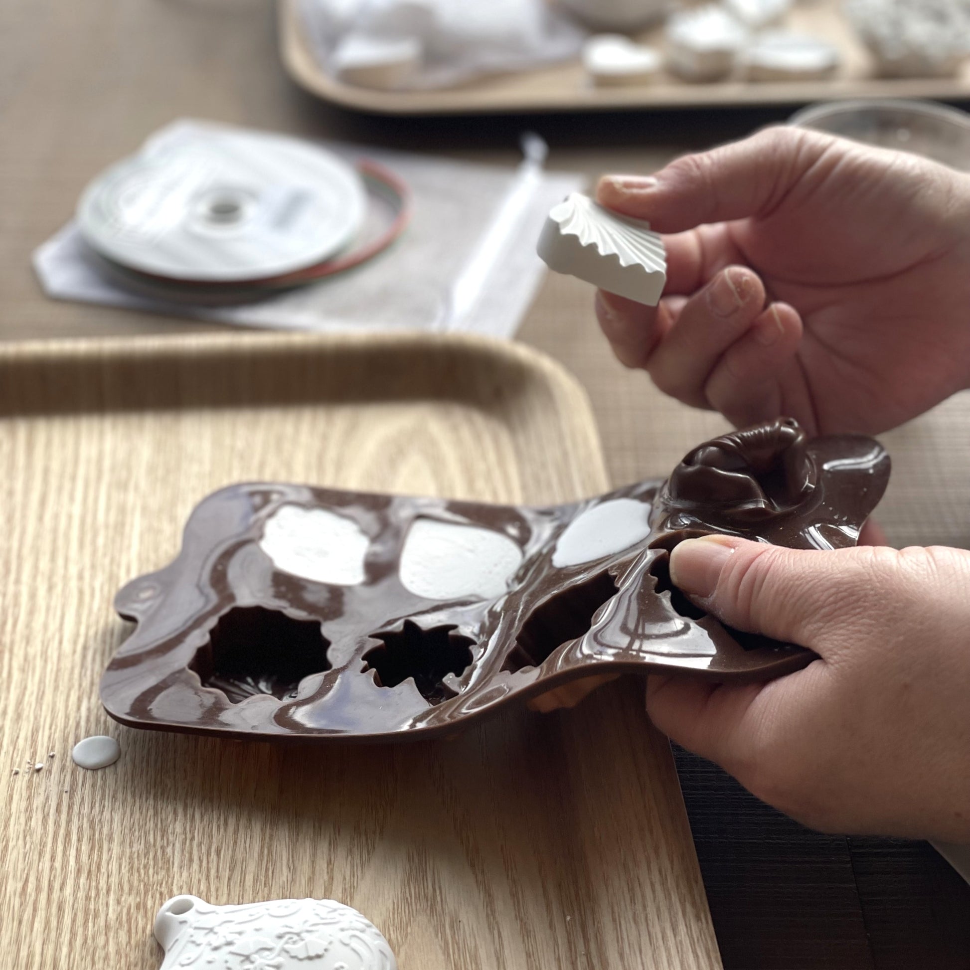エッセンシャルオイルを垂らして香りを楽しむ雑貨を作りましょう。石膏100g分を使って、お好きな型に流し込みます。固まるまで30分お待ちいただきます。